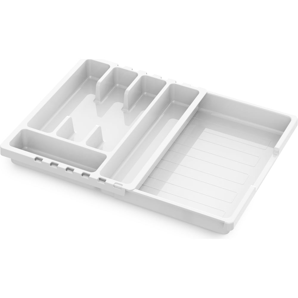 Универсальный раздвижной лоток СМАРТ для столовых приборов подойдет под разные размеры выдвижных кухонных ящиков. Ширина лотка регулируется от 30 см до 50 см. Пять основных ячеек разного размера и одно выдвижное отделение позволят удобно расположить столовые приборы, разделив их по назначению, что сократит время на поиск нужного предмета. Лоток выполнен из износостойкого пищевого пластика, устойчивого к царапинам. Материал не боится влаги, не впитывает запахи и прост в уходе - лоток можно мыть в посудомоечной машине.