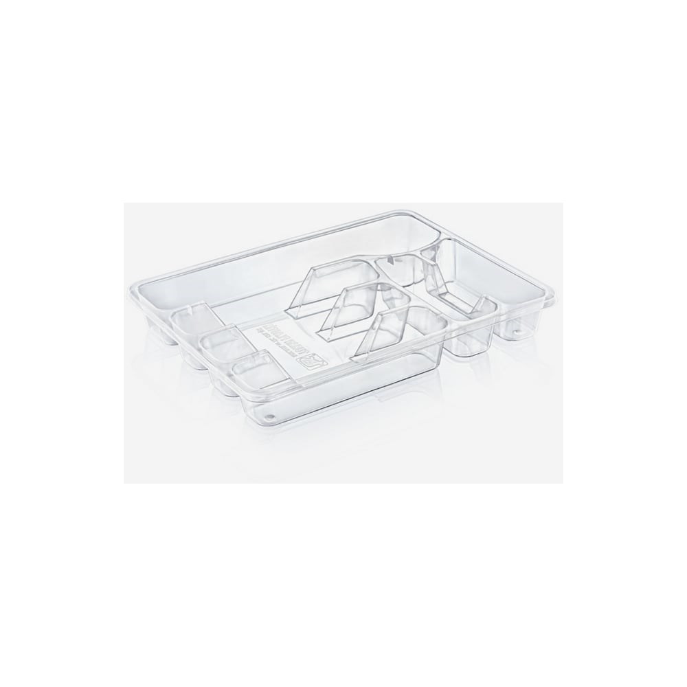 Прозрачный лоток для столовых приборов Maxi. Лоток с ячейками разных размеров, найдется место не только для вилок и ложек, но и для наиболее часто используемых кухонных инструментов: консервного ножа, овощечистки, пресса для чеснока, ножниц.Емкость изготовлена из прочного пропилена, не подверженного деформации и разбуханию из-за остаточной влаги. Размер: 375*295*50 мм (Д*Ш*В). Материал: прозрачный пластик.