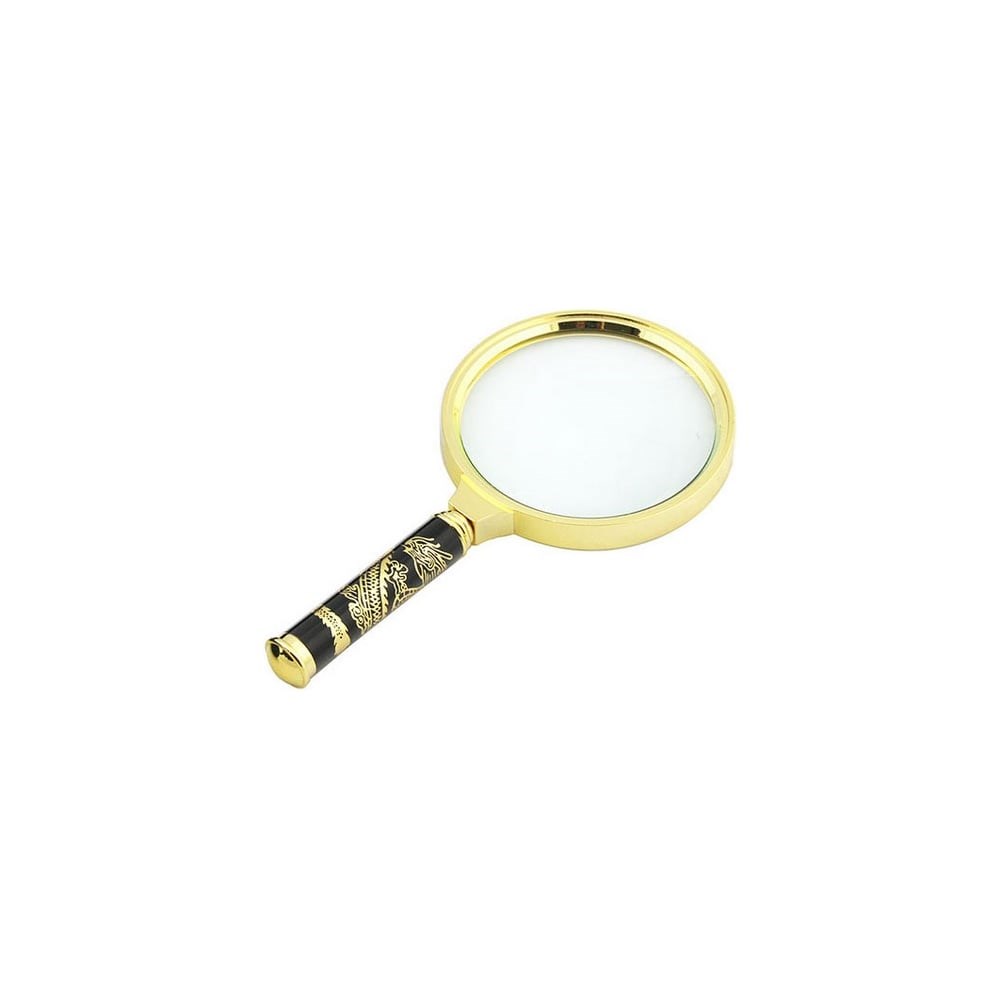 Лупа L90 Veber 22684 относится к разряду подарочных, сувенирных. Эффектная оправа "под золото" смотрится очень нарядно. На черную металлическую ручку нанесена гравировка - изображение дракона. При помощи лупы можно читать мелкий шрифт или рассматривать мелкие предметы, изображения. Диаметр линзы 80 мм, диаметр оправы 90 мм, длина ручки 75 мм.