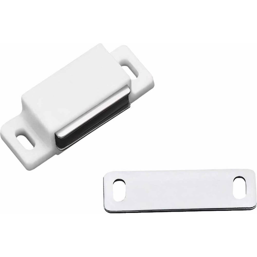 Магнитная защелка Amig белая 5 BL 185 необходима для фиксации дверок тумбочек и шкафов. Она удержит створку в закрытом положении с помощью небольшого, но мощного магнита. Купить эту защелку вы можете для корпусной мебели с дверцами любого типа. Она фиксируется на четыре самореза (по два на каждую часть).
