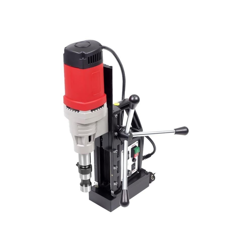 Данная модель представляет собой мощный и надежный магнитный сверлильный станок с диаметром сверления до 90 мм корончатым сверлом. Шпиндель с КМ3 (конусом Морзе №3) позволяет использовать для сверления спиральные сверла с конусной посадкой. Оснащен держателем WELDON 19. Обеспечивает точное сверление с использованием смазочно-охлаждающий жидкости (СОЖ), что значительно увеличивает срок службы корончатых сверл. Корончатое сверло max Ø 90 мм Cпиральное сверло max Ø 28 мм Рабочий ход 185 мм Держатель сверла WELDON 19 / КМ3 с подачей СОЖ Подача СОЖ (внутрь сверла из бачка) Напряжение питания 220 В / 50 Гц Регулировка оборотов плавная Частота вращения 100 - 500 об/мин Шпиндель КМ3 (конус Морзе № 3) Магнит - прижимная сила 16 800 Н (1 713 кгс)