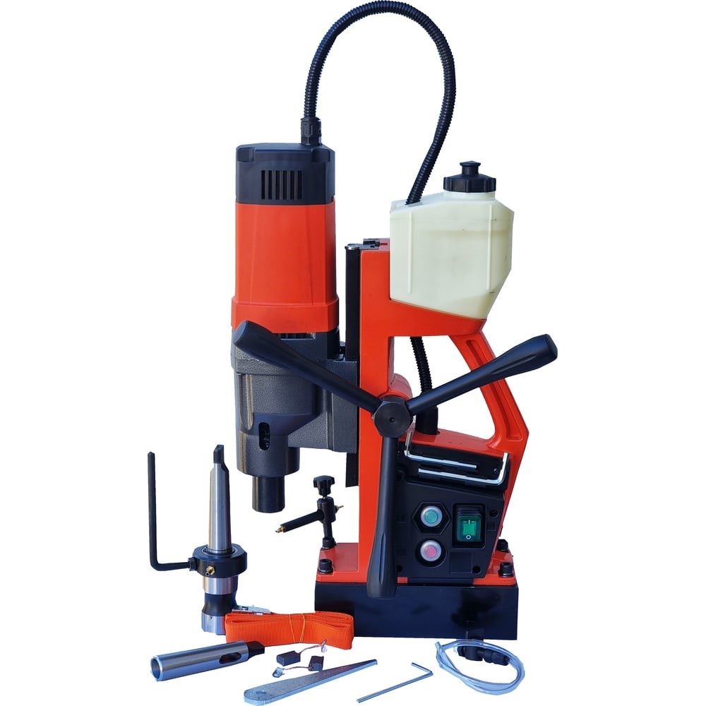Магнитный сверлильный станок PROTON FD-50N Т0000026937 предназначен для профессионального использования на строительных площадках и металлообрабатывающих предприятиях. Отличается удобством и надежностью при эксплуатации. Переход от сверления корончатым сверлом ксверлению спиральным сверлом осуществляется за несколько простых шагов. Такой станок незаменим при возведении высотных металлоконструкций, мостов и металлических колонн. Его особенность состоит в возможности регулировки максимальной высоты хода шпинделя до 300мм и возможностью плавной регулировки оборотов. Станок FD-50N снабжен удобной подачей СОЖ при сверлении, которую возможно присоединить непосредственно к самой магнитной подошве. Это в разы облегчает работу при сверлении спиральными сверлами. Благодаря небольшим размерам и весу, переносной сверлильный станок на магнитной плите фиксируется на любой высоте и может использоваться в замкнутых пространствах и других труднодоступных местах.Износостойкое магнитное основание имеет увеличенный срок службы и увеличенную максимальную удерживающую силу.