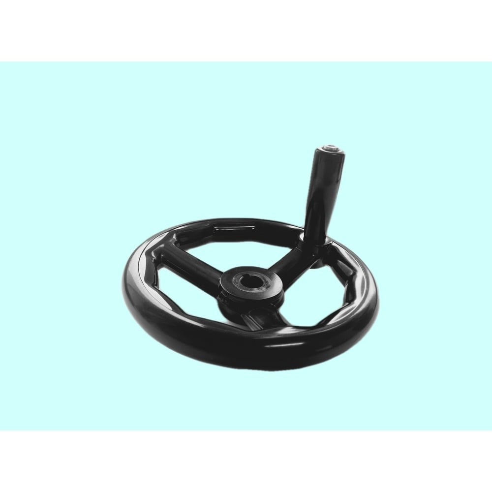 Маховик станка представляет собой классический штурвал, предназначенный для управления подвижными механизмами в различных областях промышленности. Этот элемент конструкции является неотъемлемой частью многих типов оборудования, где требуется точное и надежное ручное управление.Обод соединяется со ступицей тремя спицами.Рукоятка вращается на винте из никелированной стали, которым крепится к корпусу.Посадочное отверстие под шпонку.Для изготовления данной модели использованы высококачественные материалы:Обод и ручка изготовлены из бакелита (PF) — термореактивного полимера, который отличается своей прочностью, устойчивостью к химическим воздействиям и высоким температурам.Ступица выполнена из углеродистой стали, что гарантирует долгий срок службы и выдерживание значительных нагрузок.Цвет и размеры:Модель имеет элегантный глянцевый чёрный цвет, который придает ей солидный внешний вид и обеспечивает легкость в уходе.Диаметр маховика: 160 мм.Посадочные диаметр: 16 мм.Паз под шпонку: 5 мм.Длина ручки: 80 мм.Поверхность штурвала приятная на ощупь не изнашиваемая. Маховик станка устойчив к растворителям, маслам, смазкам и другим химическим веществам и высокой температуре.