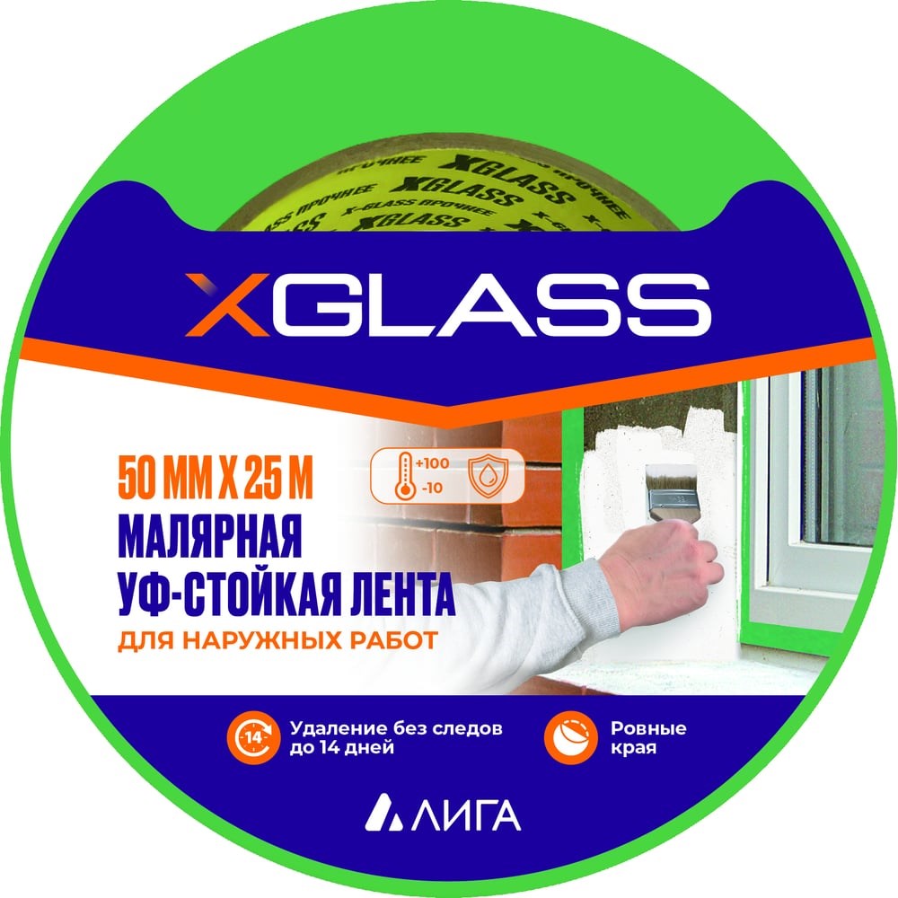 Малярная клейкая лента для наружных работ XGLASS УФ-стойкая, 100С, зелёная, 50 мм, 25 м, крепированная применяется с любыми типами красок при проведении лакокрасочных и отделочных работ снаружи помещений. Устойчивая к погоде и воздействию ультрафиолета.Не впитывает воду и краску. Удаляется без следов в течении срока до 14 дней после применения снаружи помещений. Термостойкая до 100С в течении 30 мин.Применяется также: при проведении малярных, покрасочных, штукатурных и любых других видов работ внутри и снаружи помещений, где требуется добиться ровных линий, а также не допустить смешивание различных цветов краски. Для заклеивания щелей на окнах, для крепежа полотен на дверях и т.д. В автомобилестроении при покраске транспортных средств. Для запечатывания коробок. В качестве защитного слоя для стеклянных поверхностей или любых других материалов при их транспортировке, для маркировки и т.д.