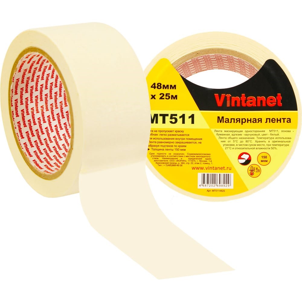 Малярная лента Vintanet 80С, MT511, 150 мкм, 48мм х 25м MT5114825 состоит из крепированной бумаги светло-бежевого цвета, покрытой каучуковым адгезивом. Крепированная основа обеспечивает отличное прилегание в углах. Каучуковый адгезив обладает мгновенной адгезией. Лента создана для внутреннего использования и не должна долго находится под воздействием окружающей среды (солнце, дождь), т.к. это может привести к сложностям при удалении. Применяется в покраске, при отделочных работах, в электронной промышленности. Чистое удаление с большинства поверхностей. Лента не пропускает краску, равномерно закрашивается, не образуя подтёков по краям.