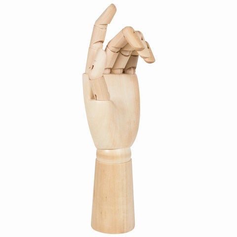 Манекен изготовлен из дерева, представляет из себя модель мужской левой руки, способной сгибаться в местах сгиба фаланг пальцев и в области запястья. Соединения предоставляют возможность зафиксировать модель в необходимом положении. Манекен является отличной альтернативой живой натуре, поскольку не может случайно это положение поменять. Высота - 30 см. Упакован в белую коробку.
