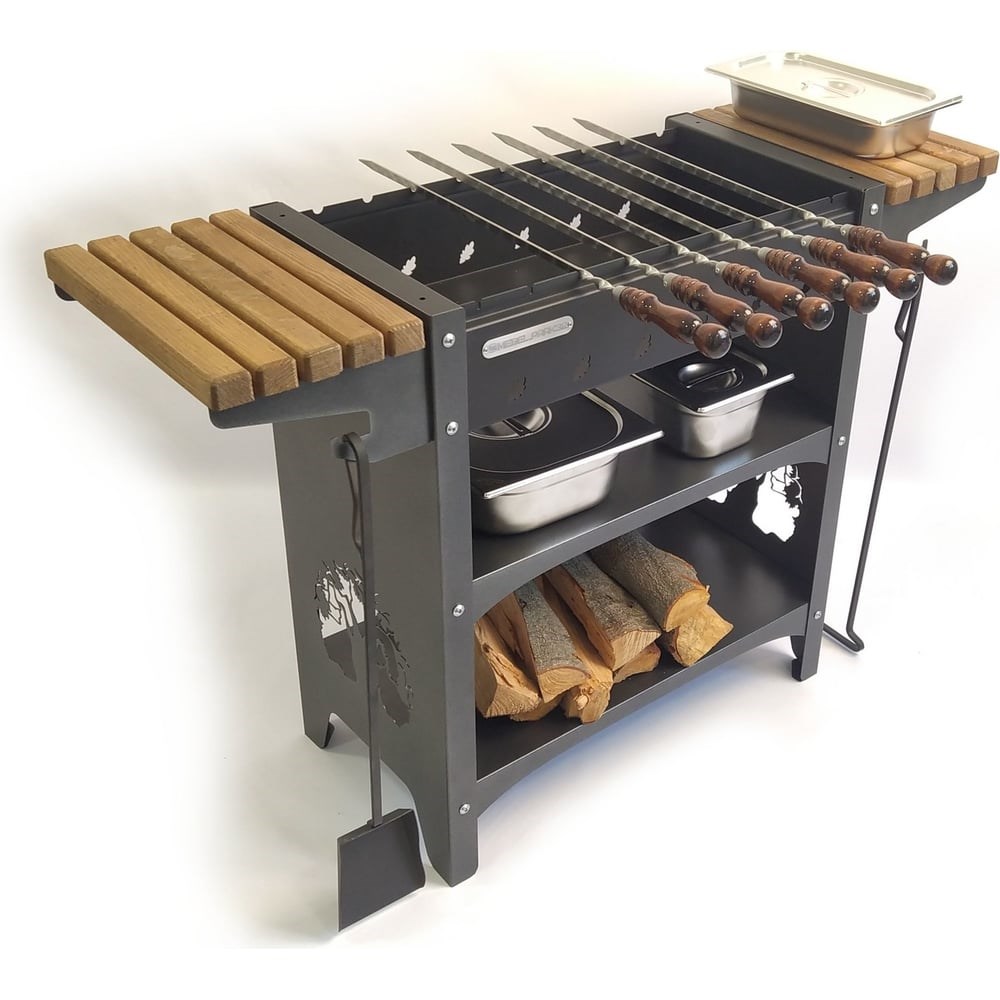 Мангал разборный, что позволяет легко транспортировать его и хранить в любом удобном месте. Опоры мангала изготовлены из листовой стали толщиной 1.2 мм. Топка имеет толщину 2 мм. Размеры мангала составляют 114х37х78 см, что делает его идеальным для приготовления блюд на открытом воздухе. В комплекте с мангалом идут две полки, которые можно использовать для хранения дров и углей. Совок, кочерга, шампура, посуда не входят в комплектацию. Материал корпуса - металл, что обеспечивает долговечность и надежность конструкции. Толщина стенок топки составляет 2 мм, что гарантирует равномерное приготовление пищи. Мангал оснащен 9 пазами для шампуров, что позволяет разместить необходимое количество продуктов для приготовления.