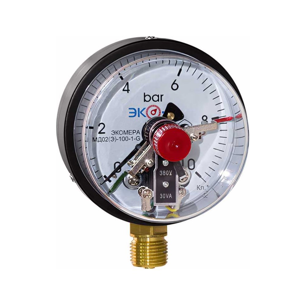 Манометр с электроконтактной приставкой ЭКО-М Экомера -100 мм, 0..1МПа, резьба М20х1,5 V МД02Э-100-М-1Мпа укомплектован электроконтактами прямого действия с подмагничиванием и подпружиниванием контактных площадок для предотвращения их "дребезга" Контакты покрыты специальным материалом для предотвращения их окисления. Точки срабатывания контактов настраиваются вручную (специальным ключом) на всем диапазоне измерения манометра. Класс точности манометра с электроконтактами - 1,5. Погрешность срабатывания контактов - 2-5% от диапазона измерения.