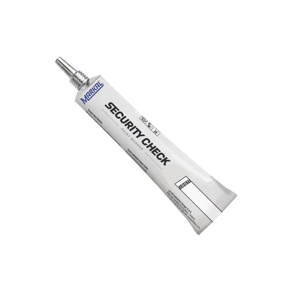 Маркер-краска для пломбирования Markal Security Check, белый 96668 это маркер-паста для пломбирования, специально разработанная для профессионалов производственного сектора, а также организаций, которые эксплуатируют ответственные машины и механизмы. Он может использоваться для нанесения пломб, проверки наличия вибрации, ослабления различных соединений и сборочных узлов, а также для контроля качества и маркировки гарантийных деталей. Этот продукт также является высококачественным аналогом продукта LockTite 7414. Markal Security Check наносится на компрессионные фитинги, шпильки, гайки, детали и узлы после их настройки на нужный момент, регулировки натяжения или положения. Это позволяет обеспечить пломбирование и фиксацию резьбовых соединений и других деталей. Паста Markal Security Check представляет собой вязкую краску, которая наносится на поверхность в виде нестираемой и водостойкой отметки. После высыхания она образует твёрдую пломбу. Если происходит раскручивание болтов, ослабление узлов или попытка взлома, пломба ломается. Этот продукт обладает отличным сцеплением с различными металлами, включая алюминий, магний, титан, нержавеющую сталь и медь, и при этом не вызывает коррозии этих материалов. Он эффективно работает в широком диапазоне рабочих температур, обеспечивая надежное обнаружение отклонений при температурах от -35°C до +200°C, рекомендуется наносить в диапазоне от -20°C до +70°C.