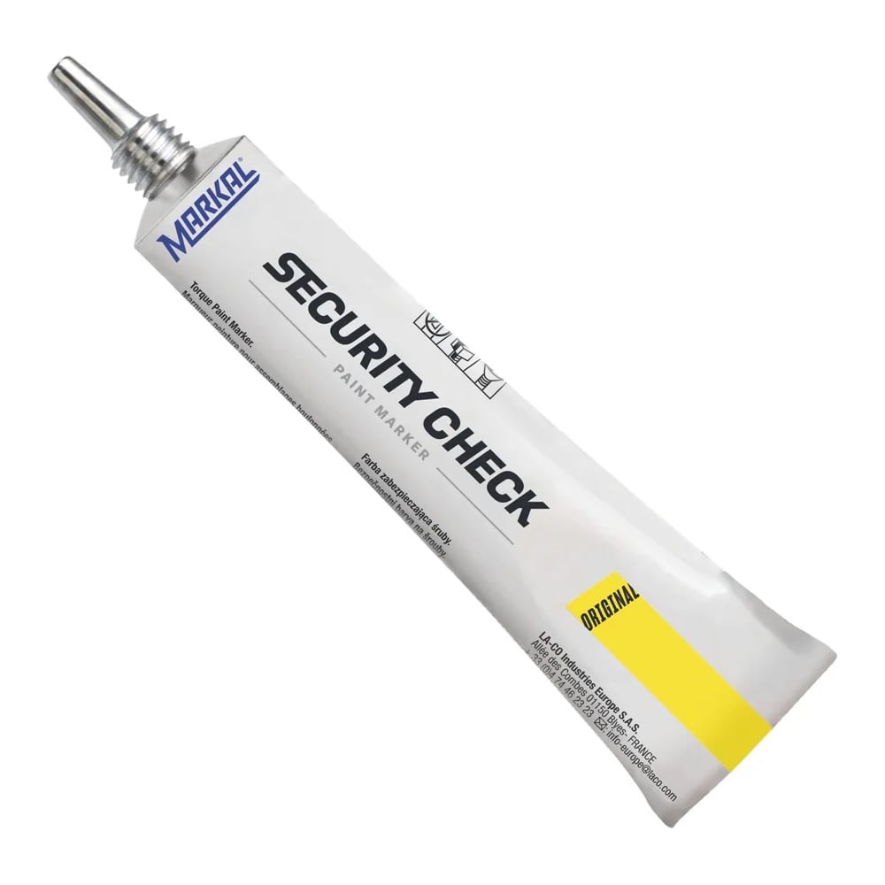 Маркер-краска для пломбирования Markal Security Check, желтый 96669это маркер-паста для пломбирования, специально разработанная для профессионалов производственного сектора, а также организаций, которые эксплуатируют ответственные машины и механизмы. Он может использоваться для нанесения пломб, проверки наличия вибрации, ослабления различных соединений и сборочных узлов, а также для контроля качества и маркировки гарантийных деталей. Этот продукт также является высококачественным аналогом продукта LockTite 7414.Markal Security Check наносится на компрессионные фитинги, шпильки, гайки, детали и узлы после их настройки на нужный момент, регулировки натяжения или положения. Это позволяет обеспечить пломбирование и фиксацию резьбовых соединений и других деталей. Паста Markal Security Check представляет собой вязкую краску, которая наносится на поверхность в виде нестираемой и водостойкой отметки. После высыхания она образует твёрдую пломбу. Если происходит раскручивание болтов, ослабление узлов или попытка взлома, пломба ломается.Этот продукт обладает отличным сцеплением с различными металлами, включая алюминий, магний, титан, нержавеющую сталь и медь, и при этом не вызывает коррозии этих материалов. Он эффективно работает в широком диапазоне рабочих температур, обеспечивая надежное обнаружение отклонений при температурах от -35°C до +200°C, рекомендуется наносить в диапазоне от -20°C до +70°C.Также можно запечатать крепеж во избежание его потери.