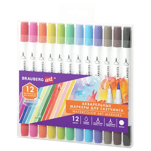 Маркеры акварельные для скетчинга двусторонние (кисть и линер) 12 цветов, BRAUBERG ART "DEBUT", 152665