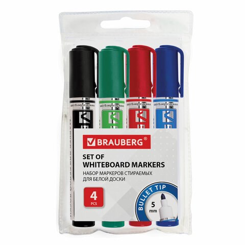 4 цвета в наборе: черный, красный, синий, зеленый. Круглый пластиковый корпус имеет диаметр 19 мм. Наконечник круглой формы обеспечивает толщину линии письма 5 мм, что позволяет писать крупным шрифтом, который будет хорошо виден. Благодаря спиртовой основе чернила быстро высыхают и не оставляют разводов, легко стираются сухой губкой. Изделие не перезаправляется. Цвет колпачка соответствует цвету чернил.