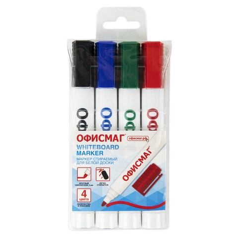 Маркеры стираемые для белой доски НАБОР 4 ЦВЕТА, ОФИСМАГ, круглый наконечник, 3 мм, 152222