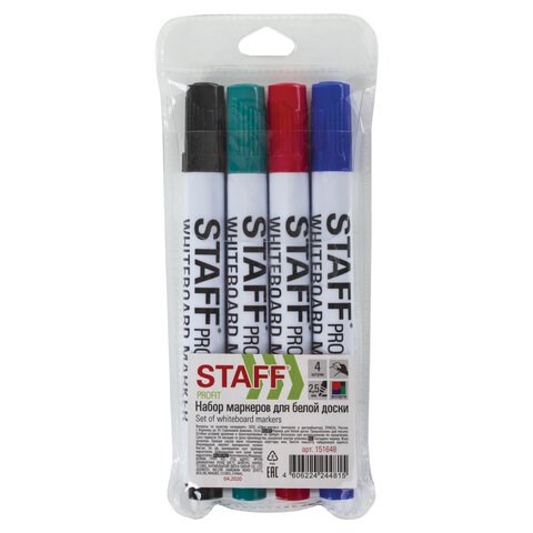 Маркеры стираемые для белой доски НАБОР 4 ЦВЕТА, STAFF "Profit" WBM-644, 2,5 мм, 151648