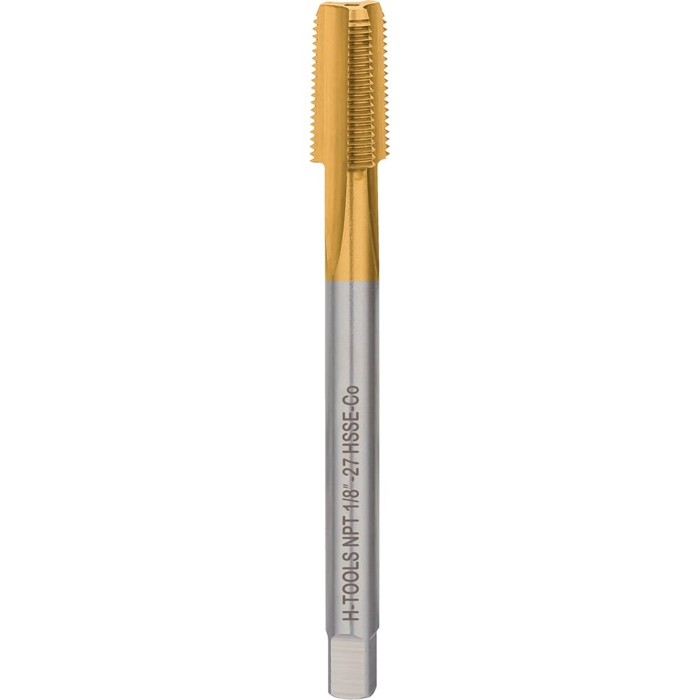 Метчик машинный конический H-Tools, предназначен для нарезания трубной конической резьбы американского стандарта NPT (National Pipe Taper) в различных материалах. Изготовлен из высококачественной быстрорежущей стали HSSE, которая гарантирует прочность и износостойкость. Покрытие TiN (нитрид титана) увеличивает термостойкость инструмента до 600°С и микротвердость до 20-25 ГПа., а низкий коэффициент трения 0,4 уменьшает возможность возникновения вибраций и холодных наплавов тем самым повышает надежность инструмента. Подходит для обработки заготовок, выполненных из легированной или нержавеющей стали, чугуна, алюминия, меди, бронзы, цинка, с пределом прочности до 1000MPa. Резьба нарезается за один этап, машинным или ручным способом. Форма заборной части C (2-3 нитки) - для сквозных и глухих отверстий. Конусность 1:16.