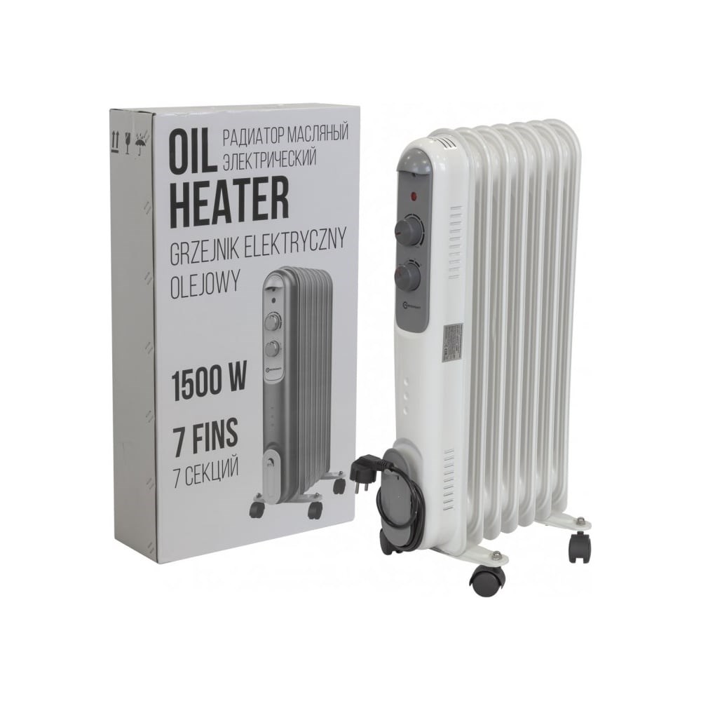 Масляный электрический радиатор - это отопительное устройство, которое использует масло для обогрева помещения. Эта технология обладает максимальной теплоотдачей и энергоэффективностью, не сушит воздух и не сжигает кислород, что особенно важно для небольших помещений. Радиатор состоит из 7 секций, каждая из которых имеет размер 110 х 580 мм. Максимальная мощность масляного обогревателя составляет 1500 Вт, что позволяет быстро и эффективно нагревать помещение. Радиатор работает при напряжении сети 220-240 В и частоте 50-60 Гц. Масляный обогреватель имеет 3 режима работы: 1. Для сохранения и поддержания тепла; 2. Для плавного нагрева и поддержания тепла; 3. Для быстрого нагрева холодного помещения. Регулируемый контроль термостата позволяет выбирать оптимальную температуру для помещения. Индикаторная лампочка загорается при нагревании и гаснет при достижении установленной температуры. Обогреватель оснащен двумя системами защиты от перегрева, что обеспечивает безопасность в использовании. Масляный обогреватель прост в обращении, не производит шума при работе и не занимает много места. Широкое основание шасси исключит опрокидывание, а специальная конструкция колесиков подарит удобство и маневренность при перемещении обогревателя . Также есть держатель для хранения сетевого шнура.