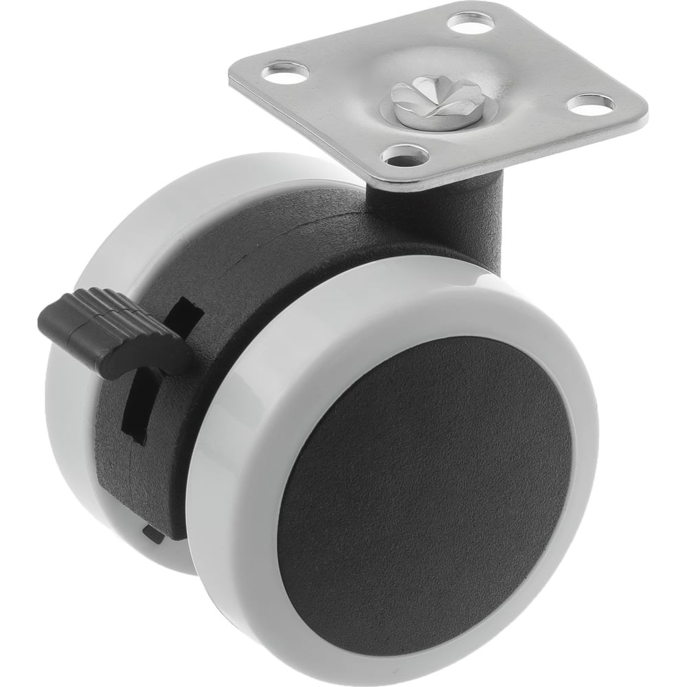 Мебельное колесо 50 мм полиуретановая шинка, площадка с тормозом 42050Sb предназначено для оснащения легкого оборудования, тумб, небольших шкафов, аппаратуры. Рекомендуется использовать внутри помещений на твердых полах. Максимальная нагрузка на одно устройство составляет 35 кг. Крепление изготовлено из нейлона. Покрытие глянцевое, оцинкованное, устойчиво к коррозии.Особенности:отличается простотой монтажа и эксплуатации;шина сделана из полиуретана;диаметр колеса составляет 50 мм;тип крепления — с пластиной;центры отверстий 26х26 ммплощадка 38х38 мм