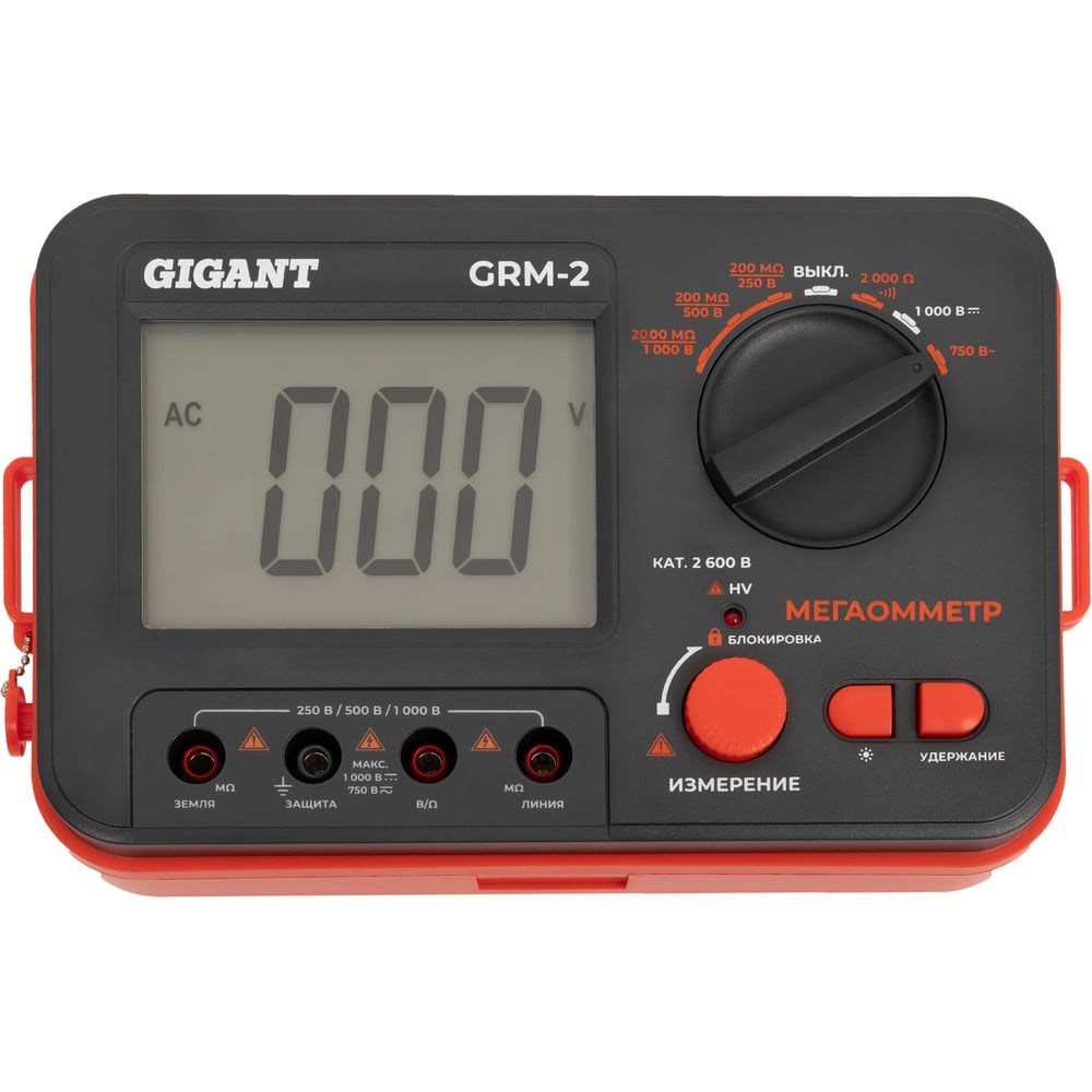 Мегаомметр Gigant GRM-2 предназначен для измерения сопротивления изоляции в различных промышленных отраслях. В случае возникновения высокого напряжения в исследуемой электрической цепи срабатывает световая индикация. ЖК-дисплей прибора имеет интегрированную подсветку, позволяющую использовать его при любых условиях освещенности. Тестовое напряжение 250, 500, 1000 В