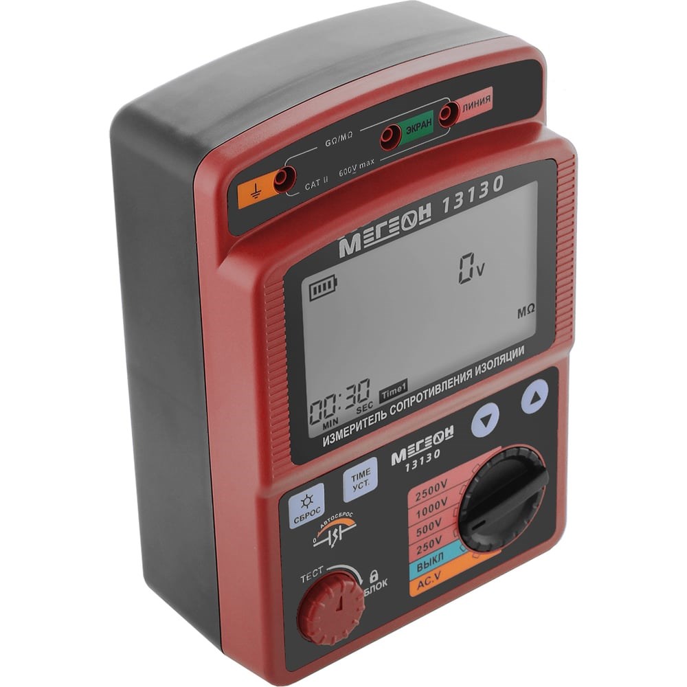 МЕГЕОН 13130 представляет собой портативный измеритель сопротивления изоляции бюджетного ценового диапазона. Данная модель, как и другие мегаомметры МЕГЕОН, отличаются высокой надежностью и богатым набором встроенных функций. МЕГЕОН 13130 используется для определения параметров (сопротивления) изоляции, используя при этом высокое испытательное напряжение (до 2500 Вольт). Функция автоматического выбора диапазона, измерение по таймеру и оповещение при обнаружении напряжения в исследуемой сети обеспечивают проведение точных и безопасных измерений. Мегаомметр оснащен большим ЖК-дисплеем с интегрированной светодиодной подсветкой, что позволяет работать с прибором даже в темное время суток. Кроме функций, характерных для всех приборов данного ценового диапазона, мегаомметр МЕГЕОН 13130 также оснащен функцией автоматической разрядки, что в свою очередь обеспечивает безопасность пользователя при работе с прибором. На дисплей прибора выводится вся необходимая информация - текущие показатели сопротивления, уровень заряда элемента питания. При обнаружении напряжения в исследуемой цепи, прибор оповестит пользователя звуковым сигналом. Стоит отметить, что МЕГЕОН 13130 может работать как от батареек, так и от сетевого адаптера 12 вольт.