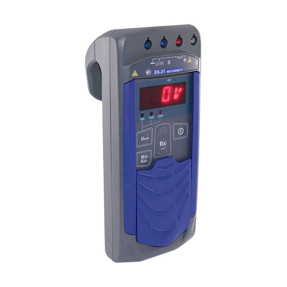При использовании прибора есть возможность установки испытательного напряжения. Доступные варианты: 500, 1000 и 2500 В. Есть система защиты от случайной подачи контрольного напряжения в необессточенную цепь. Цифровой мегаомметр Е6-31 с поверкой оснащен функцией автоматического расчета коэффициента абсорбции изоляции контролируемой цепи. Если он ниже 1.3, рекомендуется просушивание. Предусмотрен автоматический переход в режим энергосбережения при бездействии устройства в течение 2.5 мин. Есть защита от случайного включения при транспортировке — подвижная крышка. Мегаомметр оснащен функцией программирования времени измерения сопротивления. Его можно установить в диапазоне от 1 до 10 минут. Имеется встроенная система защиты от помех в контролируемых цепях, а также от наведенных токов промышленной частоты.