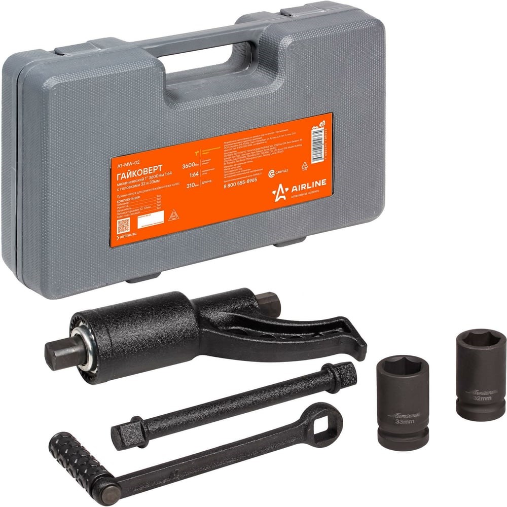Механический гайковерт AIRLINE 1" 3600 Нм, 1:64, с головками 32 и 33 мм, пластиковый кейс AT-MW-02 представляет собой многоступенчатый редуктор, который многократно увеличивает крутящий момент прилагаемый к рукоятке. Таким образом, без больших усилий оператора можно отвинтить гайки крепления колёс на грузовиках и специальной технике. Инструмент выполнен из прочных и качественных материалов, обладающих надежностью и долговечностью. Гайковерт поставляется в удобном пластиковом кейсе для рационального хранения и транспортировки.