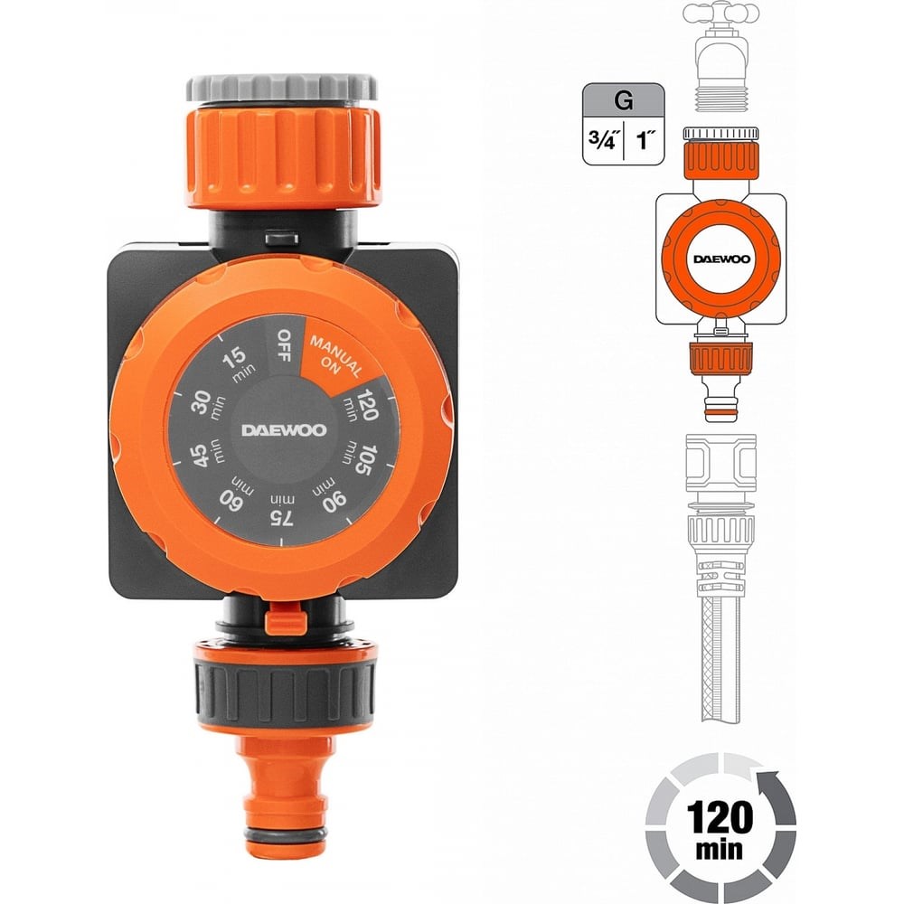 Возможность установки времени полива от 0 до 120 минут Режим «Ручного полива» для быстрой подачи воды без ограничения по времени Фильтр грубой очистки для защиты механизмов таймера Подходит для крана с внешней резьбой G 3/4” (26,5 мм) или G 1” (33,3 мм) Высококачественный пластик для долгого срока службы Совместим с базовой системой полива DAEWOO и других производителей