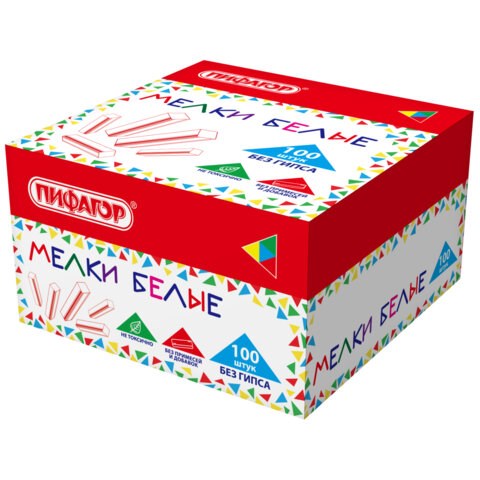 Мел белый БЕЗ ПРИМЕСЕЙ квадратный 100 штук, мягкое письмо, ПИФАГОР, картонная упаковка, 274123