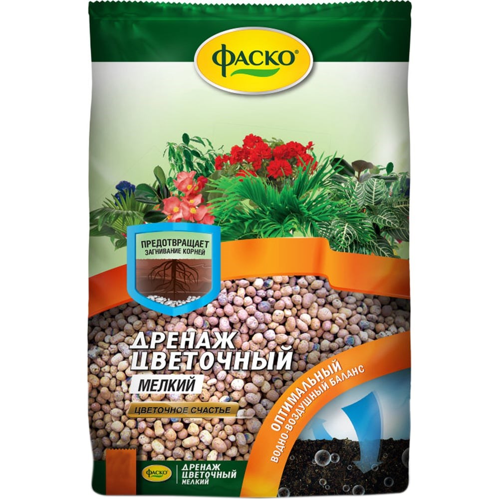 Дренаж Фаско Цветочное счастье мелкий, 1 л Of000006709 предназначен для выращивания комнатных растений и других культур внутри помещений. Обеспечивает оптимальный водно-воздушный баланс. Содержит питательные микроэлементы, необходимые для здорового роста и развития растений. Процентное соотношение дренажа к грунту варьируется в зависимости от вида растения.
