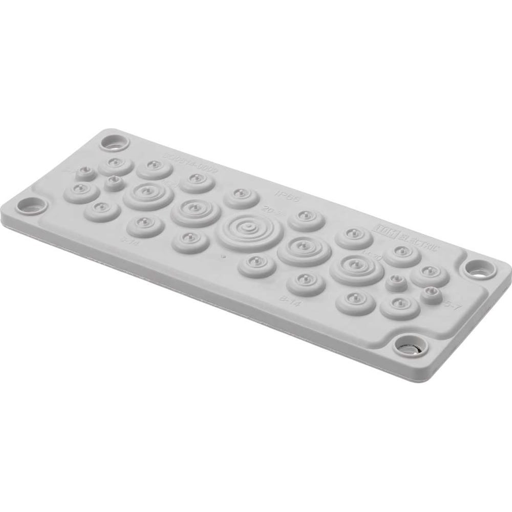 Дополнительные технические характеристики кабельного мембранного ввода TDM КВМ-25 SQ0814-0009: Назначение - для герметичного ввода проводов и/или кабелей в электрощитовое оборудование с целью защиты проводников от механического повреждения; для защиты сборки от проникновения пыли и влаги в местах ввода. Количество вводов, шт. - 25. Диаметр отверстия (количество вводов, шт), мм - 5–7 (4 ввода); 8-14 (16 вводов); 14-20 (4 ввода); 20-26 (1 ввод). Наличие крепежного элемента в комплекте - есть. Ширина, мм - 216. Высота, мм - 84. Глубина (крепеж), мм - 10. Габариты крепежа (ширина х высота), мм - 193х62.