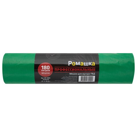Мешки для мусора 180 л, зеленые, в рулоне 20 шт., ПВД 30 мкм, 90x110 см, РОМАШКА "ПРОФИ", ВР-0084