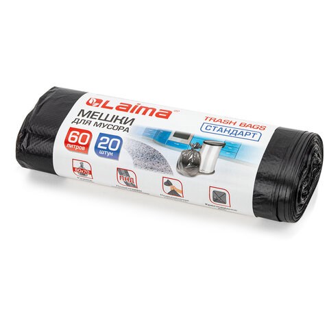Мешки для мусора 60 л, черные, в рулоне 20 шт., ПНД 11 мкм, 60х70 см, LAIMA стандарт, 601381