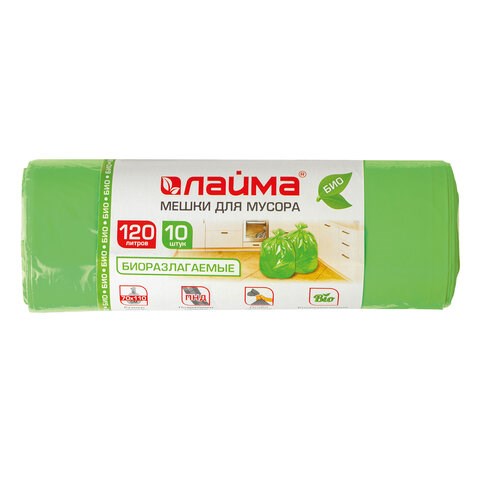 Изготовлены из полиэтилена низкого давления (ПНД) плотностью 17 микрон и имеют объем 120 литров. Размер мешка - 70х110 см (±5%). Поставляются в рулоне по 10 штук. Преимуществами данных мешков для мусора являются: биоразлагаемость материала, большой объем и высокая грузоподъемность. Абсолютно безопасны для окружающей среды. Биоразлагаемые мешки для мусора созданы из материалов, которые после использования разлагаются за 1,5-2 года под действием кислорода, воды и света и превращаются в органические соединения. Поэтому данный вид мешков пользуется всё большим спросом. Биоразлагаемые мешки полностью аналогичны обычным мешкам для мусора по прочности и внешнему виду.