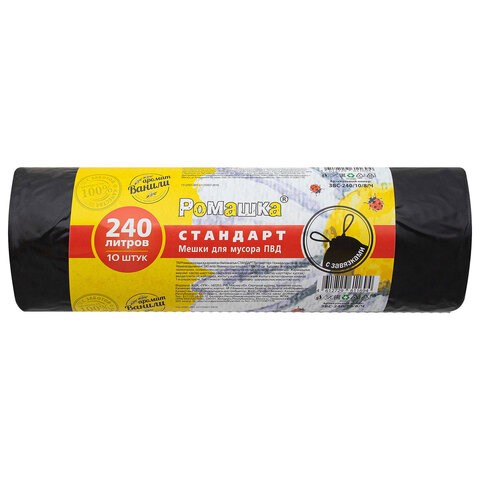 Мешки для мусора с завязками 240 л, черные в рулоне 10 шт., ПВД 30 мкм, 110х115 см, РОМАШКА ЗВС-240/10/8/Ч
