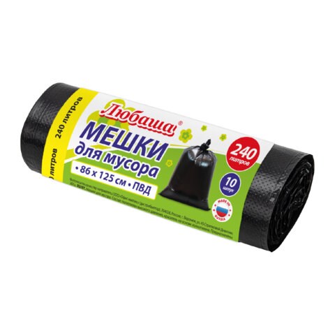 Мешок для мусора 240 л., черные в рулоне 10 шт., ПВД 20 мкм, 86х125 см, ЛЮБАША супер-эконом, 608919