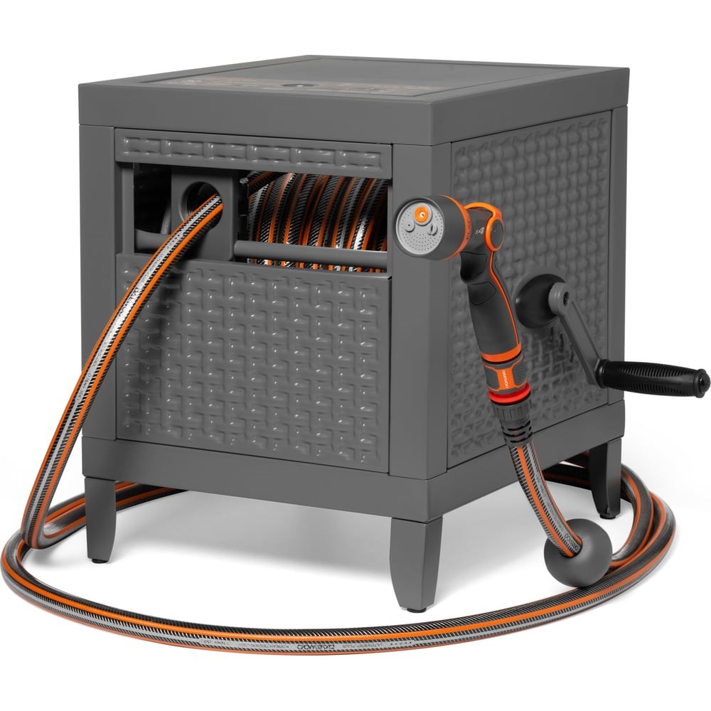 Катушка оснащена шлангом UltraGrip Plus (диаметр 15 мм, 30 м). Надежный, гибкий шестислойный шланг с двойным армированием и уникальными ребристым профилем выдерживает давление до 35 бар. Равномерная смотка шланга без заломов и перекручивания. Направляющая для шланга и эргономичная ручка барабана сохранят руки в чистоте. Корпус и барабан катушки выполнен из стали, защищенной от коррозии, для долгого срока службы. Привлекательный дизайн послужит украшением любого сада. Полный набор аксессуаров для быстрого начала работы.
