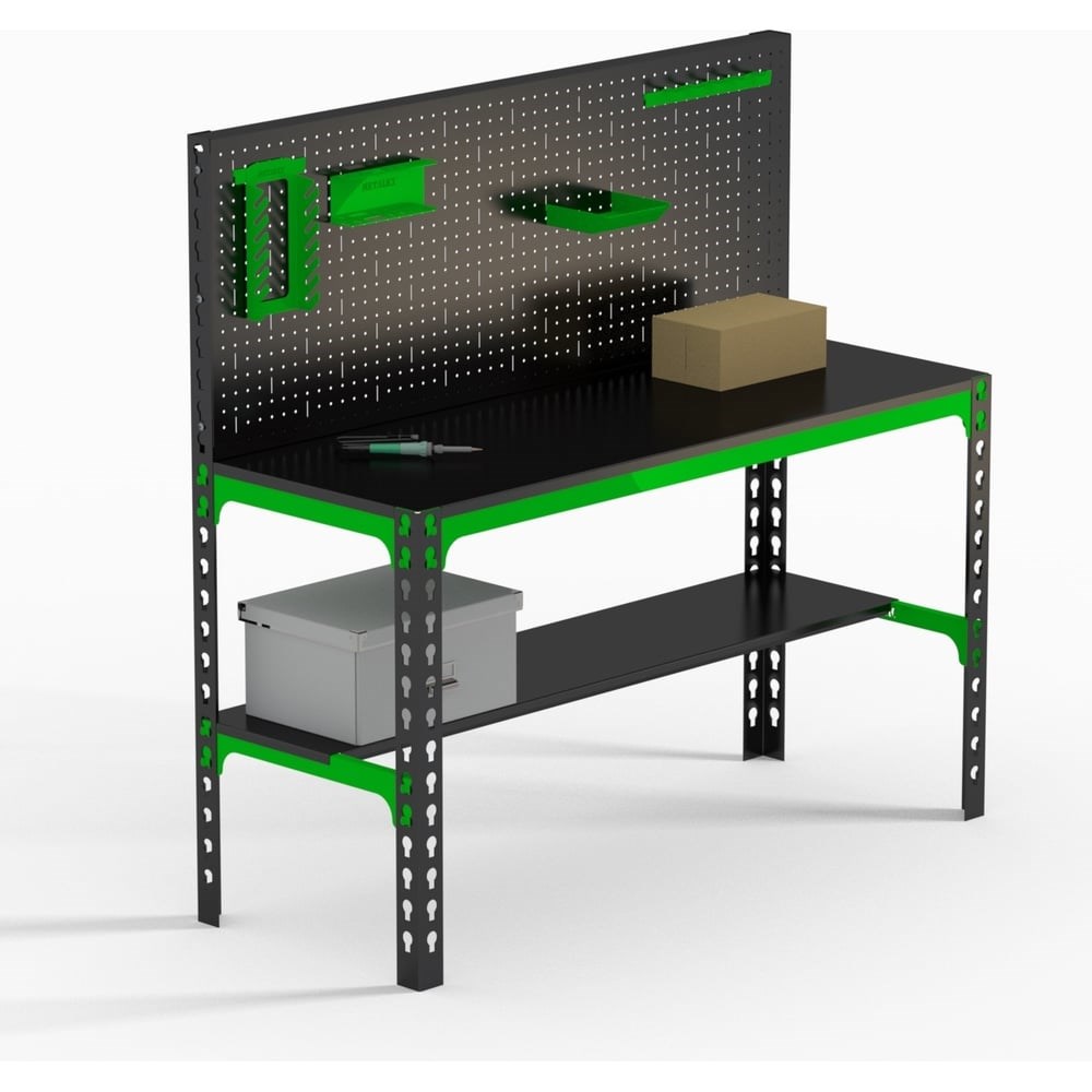 Металлический стол Metalex 750x1000x500 + перфопанель с комплектом аксессуаров SMMPRIA751050 с предназначен для удобной организации рабочего места. Стол используется на производствах, на складах, в гаражах, мастерских, и на других объектах. Перфопанель с комплектом аксессуаров является дополнительный элементом, который увеличивает рабочее пространство и структурирует хранение инструмента. Размер перфопанели: 1000x500х50 из стали толщиной 0.8 мм. Крепление перфопанели : Болтовое .Допустимая нагрузка на конструкцию – до 260 кг. Стол выполнен из стали толщиной 1,5 мм, что обеспечивает надежность и долгий срок службы. Конструкция сборно-разборная. Металлический стол отличается практичностью, мобильностью, прочностью и долговечностью в использовании. Крепление элементов стола : Безболтовое.