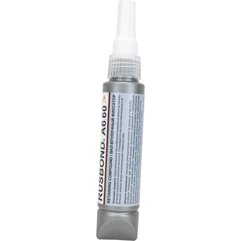 Продукт применяется для фиксации цилиндрических деталей (в зазоре до 0,5 мм), особенно необходим, где требуется высокая прочность соединения и наблюдается большой износ поверхностей узла, например, восстановление посадок подшипников, втулок, гильз навалы, в корпуса насосов, редукторов, шпоночных пазов, строительного и горного оборудования, работающих в условиях высоких нагрузок, вибраций, перепадов температур и агрессивных сред. Состав RusBond A6.60 - однокомпонентный пастообразный анаэробный фиксатор цилиндрических соединений высокой прочности. Процесс отверждения обусловлен отсутствием воздуха в небольших зазорах между металлическими поверхностями.
