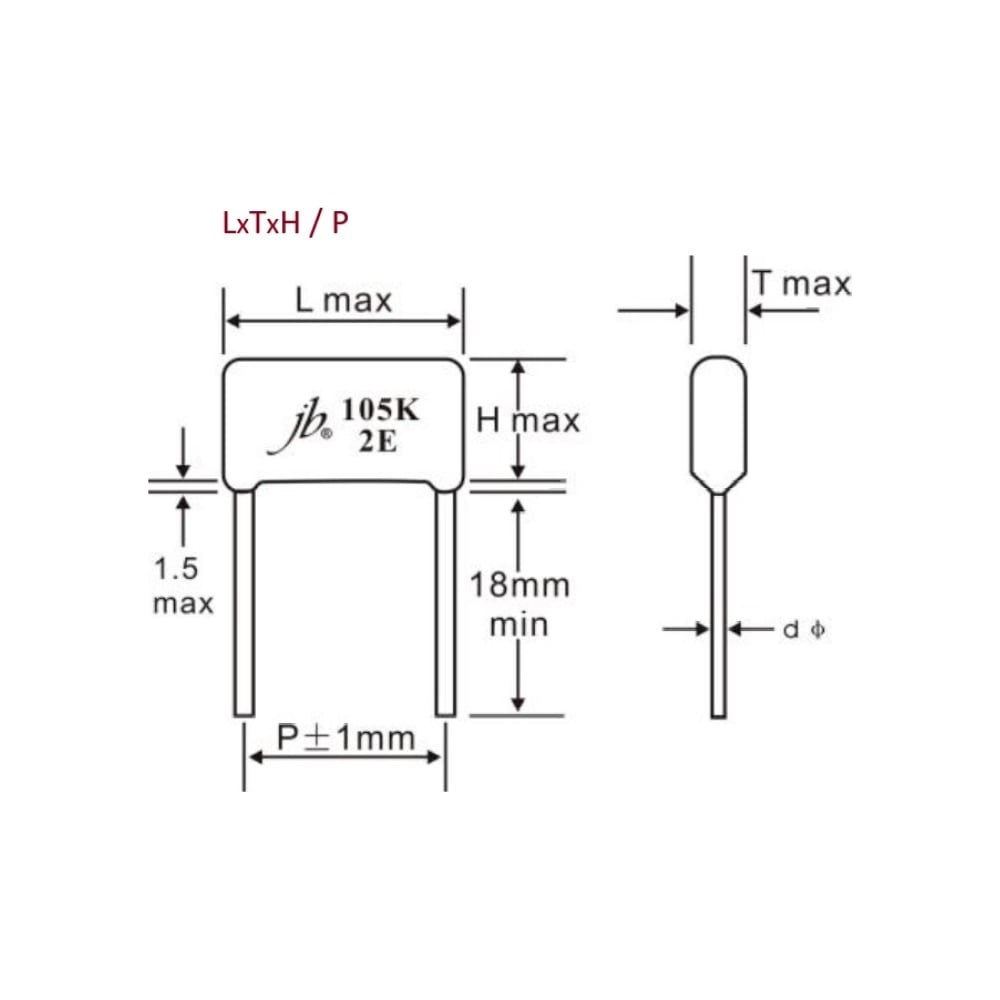 Конденсаторы серии JFB выполнены по технологии Metallized Polyester Film: в качестве диэлектрика в этих конденсаторах используется полиэстеровая (полиэтилентерефталатная) пленка, с напылением слоя металла (металлизацией). Конденсаторы серии JFB – Конденсаторы данной категории более известны под названиями K73-17 на отечественном рынке, и CL21 – на зарубежном. Полиэтилентерефталатные конденсаторы имеют высокие диэлектрическую проницаемость и прочность. Корпус выполнен с эпоксидным покрытием, повышающим параметры теплостойкости, влагостойкости, а также увеличивающим сопротивление к воздействию внешних агрессивных сред и растворителей. Это аналог существующих серий B32591 … B32594 от Epcos, MKT 368 от Vishay, ECQE от Panasonic, MKS от Wima. Общие технические характеристики: Материал диэлектрика: полиэтилентерефталат Номинальное напряжение: 100 В (2A), 250 В (2E), 400 В (2G), 630 В (2J) постоянного тока Диапазон номиналов емкостей: 0.01 ~ 6.8 мкФ Допустимое отклонение емкости: ±5%, ±10%, ±20% Коэффициент затухания: ≤ 0.01 (1 кГц) Температурный диапазон: -40 ~ +85°C