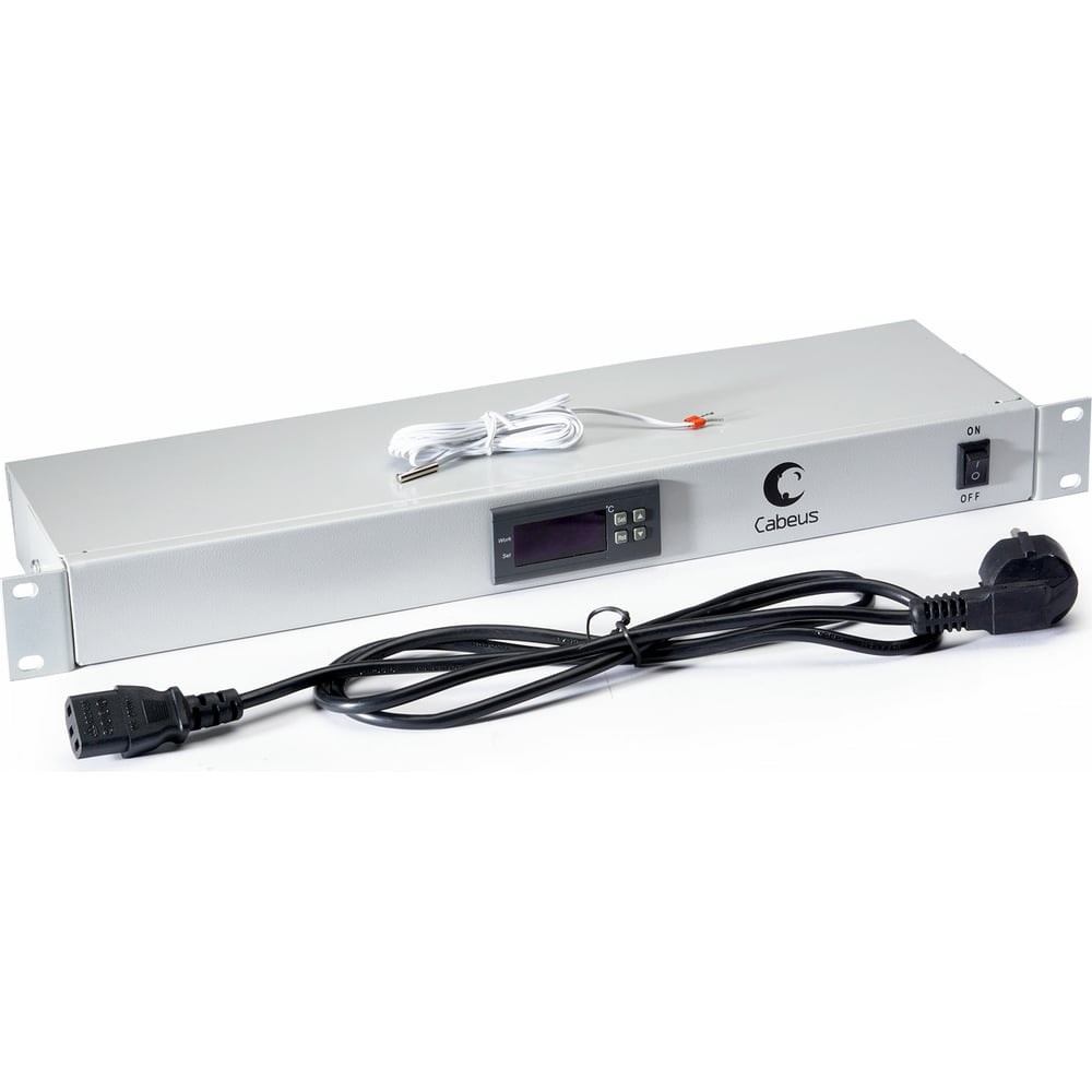 Микропроцессорная контрольная панель со встроенным термостатом Cabeus, JG01 имеет дополнительные технические характеристики: Количество подключаемых вентиляторов: 2. Длина шнура питания панели: 1,5м. Длина провода температурного датчика: 2м. Параметры электропитания: 220-250 В, 50/60 Гц. Потребляемая мощность: не более 5 Вт. Питание вход: разъем IEC 320 C14 (шнур питания входит в комплект). Питание выход: разъем IEC 320 C13 2 шт. Корпус: металл 1,2 мм. Диапазон рабочих температур: +1…+40. Допустимая влажность: до 80%.