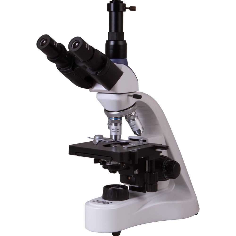 Лабораторный микроскоп (тринокулярный ахромат) Levenhuk MED 10T с ахроматической оптикой и тринокулярной насадкой разработан специально для профессиональных микроисследований. Его можно использовать в биохимии, медицине, классической биологии и других областях науки. Микроскоп позволяет изучать образцы на увеличении от 40 до 1000 крат. Он станет отличным дополнением к арсеналу оптической техники кафедры вуза, исследовательской лаборатории или медицинского кабинета. Благодаря тринокулярной насадке можно одновременно вести визуальные наблюдения обоими глазами и выводить картинку с объектива на внешний экран при помощи цифровой камеры (камера не включена в комплект поставки). Насадку можно поворачивать вокруг своей оси на 360°, визуальный блок отклонен на 30°. Подобная конструкция насадки удобна, если образец должны наблюдать несколько исследователей. Ахроматическая оптика с антигрибковым покрытием позволяет детально рассматривать даже сложные структуры. Широкопольные окуляры дают 10-кратное увеличение, у них есть диоптрийная коррекция. Хороший угол обзора дает возможность изучать протяженные образцы. В револьверное устройство устанавливаются четыре объектива. Они дают разное увеличение, объективы с высокой кратностью имеют пружинящие оправы для защиты от случайных повреждений. При наблюдениях можно применять масляную иммерсию (используется 100-кратный объектив). Настройка резкости производится вращением ручек грубой и точной фокусировки. Двухкоординатный предметный столик снабжен препаратоводителем, с помощью которого образцы устанавливаются под объективом микроскопа. Под столиком находится конденсор Аббе с ирисовой диафрагмой. В специальный держатель можно устанавливать светофильтры для повышения контрастности передаваемой картинки. Под конденсором находится яркая светодиодная подсветка, для питания которой используется сеть переменного тока. Яркость подсветки можно регулировать. Микроскоп Levenhuk MED 10T – тринокулярный ахромат для научно-исследовательской или медицинской лаборатории, который подходит для проведения сложных наблюдений в светлом поле.