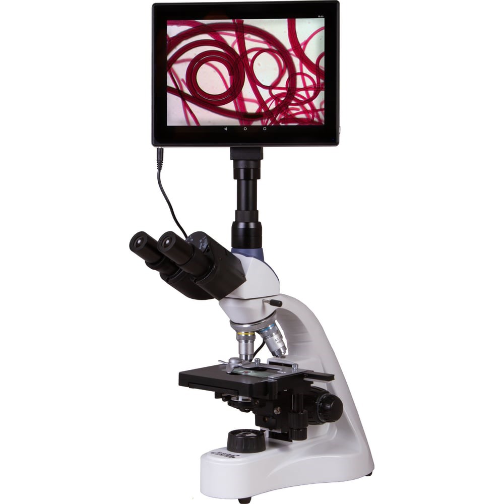 Levenhuk MED D10T LCD – цифровой микроскоп, который интересен не только своими оптическими возможностями, но и камерой с 5-мегапиксельным сенсором и ЖК-экраном. Микроскоп подходит для визуальных наблюдений и для создания цифровых архивов наблюдений. Возможности этого оптического прибора пригодятся в медицинской лаборатории, исследовательском центре, на кафедре вуза. Микроскоп (LCD) стоит купить, если вы занимаетесь профессиональными исследованиями и много часов проводите за изучением микрообразцов. ЖК-экран значительно снижает нагрузку на зрение. Ахроматическая оптика высокого класса Тринокулярная насадка разделена на бинокулярную визуальную часть и отдельную вертикальную трубку, в которую устанавливается цифровая камера. Насадку можно вращать на 360°, а визуальный блок отклонен на 30-градусный угол. Для наблюдений используются широкопольные окуляры с диоптрийной коррекцией, которые дают 10-кратное увеличение. Револьверное устройство вмещает четыре ахроматических объектива, которые передают детализированную и контрастную картинку. Объективы 40х и 100х имеют пружинящие оправы, 100-кратный объектив используется для наблюдений иммерсионным методом. Оптические поверхности окуляров и объективов защищены антигрибковым покрытием. Цифровые возможности микроскопа Цифровая камера с 5-мегапиксельным чувствительным сенсором предназначена для фото- и видеосъемки. Высокая детализация изображений и плавная скорость видеороликов позволяют использовать их для профессиональных исследований. Изображение с объектива микроскопа выводится на встроенный ЖК-экран, поэтому для использования камеры не требуется дополнительное оборудование. Камера может работать с разными аксессуарами: клавиатурой, наушниками, внешним монитором, картами памяти. Специальная программа дает возможность редактировать отснятый материал. Легкая и удобная работа в лаборатории Камера делает работу в лаборатории более легкой и удобной для исследователя – нет нужды постоянно напрягать зрение, рассматривая образцы через окуляры: все можно увидеть на встроенном ЖК-экране с сенсорным управлением. С помощью ПО можно корректировать размер, яркость, контрастность, гамму, резкость и насыщенность изображения, менять время выдержки и баланс белого, проводить калибровку камеры с объективами, измерять образцы или отдельные структуры (доступно несколько единиц измерения). Кроме того, программа позволяет проводить анализ частиц. Яркое освещение образцов мощным светодиодом Микропрепараты устанавливаются на двухкоординатный предметный столик, под которым находится яркая светодиодная подсветка. Также под ним расположен конденсор Аббе с ирисовой диафрагмой и держателем фильтра. Рядом есть ручки грубой и точной фокусировки. Яркость подсветки регулируется. Для питания подсветки требуется подключение к сети переменного тока.