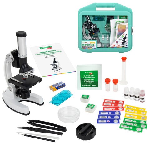 Микроскоп с подсветкой в кейсе, 74 предмета, в т.ч. набор из 16 микропрепаратов в подарок, увеличение 300х,600х,1200х, BRAUBERG KIDS, 391399