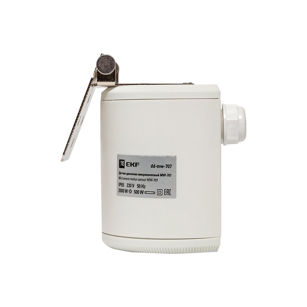Микроволновый датчик движения EKF MW-707 2000Вт, IP65 dd-mw-707 для помещений с высокими потолками имеет универсальную конструкцию и может устанавливаться на стену, на потолок или в корпус светильника. Датчик можно устанавливать на улице. При фиксации движения датчик коммутирует подключенную нагрузку (до 1200Вт). И автоматически выключается, если движение прекращается (время настраивается в диапазоне от 10 секунд до 15 минут). Уличный датчик движения имеет функцию контроля освещенности. Если освещенность в зоне детекции выше заданного уровня, то датчик движения не реагирует и экономит электроэнергию в дневное время. Микроволновый датчик движения имеет повышенную чувствительность и может детектировать движение сквозь тонкие преграды (гипсокартон, стекло и т.д.). Угол обзора датчика - 360° , радиус детекции - 30м. В комплекте пульт управления. ДОПОЛНИТЕЛЬНЫЕ ХАРАКТЕРИСТИКИ Номинальное напряжение 230В Номинальная частота 50Гц Диапазон рабочих температур от –35 до +70°С Влажность не более 93% Детектируемая скорость объекта 0,6-1,5 м/с Потребляемая мощность 0,1-0,45 Вт Высота установки 4-15 м Порог срабатывания по освещенности 5-200Лк (регулируется) Время отключения 10-1800с (регулируется) Максимальная мощность нагрузки (для ламп накаливания/светодиодных) 2000 / 1000 В Угол обзора 360° Максимальный радиус детектирования 30 м Степень защиты IP65