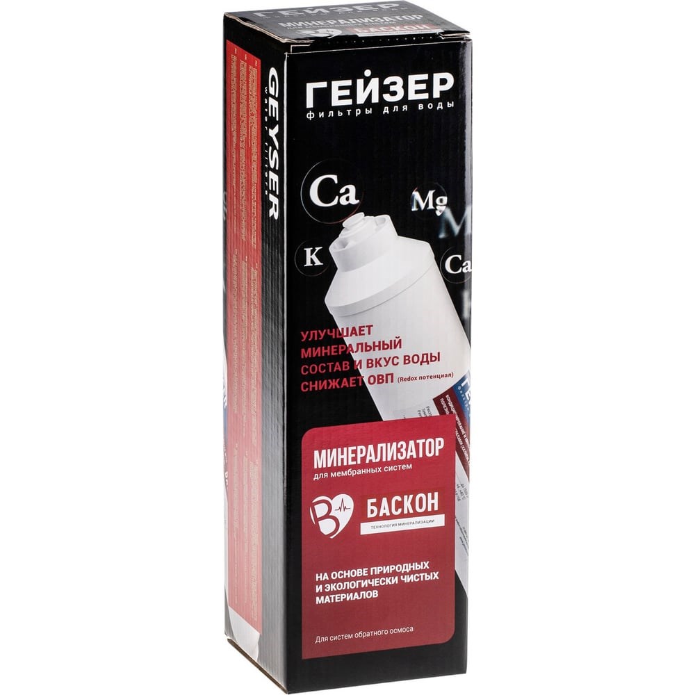 Гейзер минерализатор Баскон 25653 устанавливают в системы обратного осмоса после постфильтра для минерализации воды - насыщения её кальцием, калием, магнием в легкоусвояемой форме. В результате вода имеет сбалансированный минеральный состав.Минерализатор не комплектуется фитингами.Ресурс: до 1500 л;Скорость потока: до 3,5л/мин;Давление: до 6 атм;Температура очищаемой воды: +4…+40°С;Рекомендуемый срок замены: 1 раз в 6 месяцев;Срок хранения без нарушения упаковки: 3 года.
