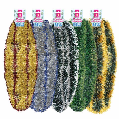 Длина мишуры в расправленном виде составляет 2 м, диаметр – 7 см. Материал мишуры – полиэтилентерефталат. В транспортной упаковке – 65 штук, поставляется в нескольких вариантах цвета: зеленом с белыми кончиками (15 шт.), зелёном с золотистыми кончиками (15 шт.), серебристом с синими кончиками (15 шт.), зелёном с салатовыми кончиками (10 шт.), золотистом с красными кончиками (10 шт.).