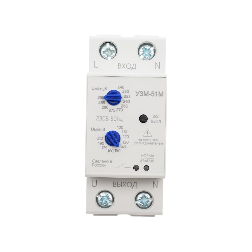 Устройство защиты многофункциональное УЗМ-51М УХЛ4 (артикул A8302-16931958) предназначено для использования в квартире, доме, офисе и т.д. с целью защиты однофазных потребителей от работы на повышенном или пониженном сетевом напряжении; защиты однофазных потребителей от разрушающего воздействия импульсных скачков напряжения, вызванных срабатыванием близкорасположенных и подключённых к этой же сети электродвигателей, магнитных пускателей или электромагнитов.Технические характеристики:Порог отключения нагрузки при повышении напряжения: 240…290ВПорог отключения нагрузки при снижении напряжения: 100…210ВГистерезис возврата верхнего и нижнего порога от установленного значения: 3%Задержка включения /повторного включения (выбирается пользователем): 6мин/10сНоминальный ток нагрузки:63А/250В (14 кВт)