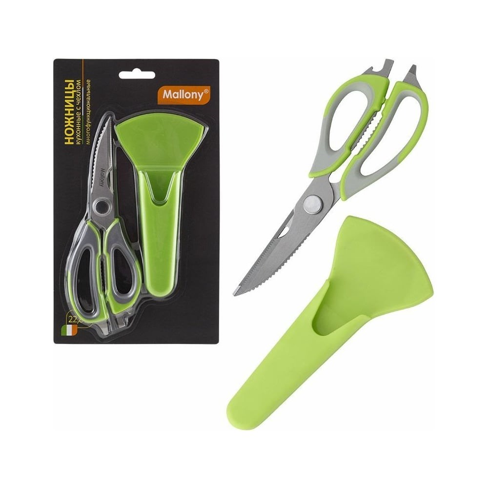 Кухонные ножницы Mallony многофункциональные KS-128С с чехлом, 22,8 см 920104 подходят для бытового применения. Изделие предназначено для разделки птицы или рыбы, вскрытия упаковок, консервных банок и бутылок. Лезвия ножниц сделаны из прочной стали. Рукоятки не скользят в руке во время работы.