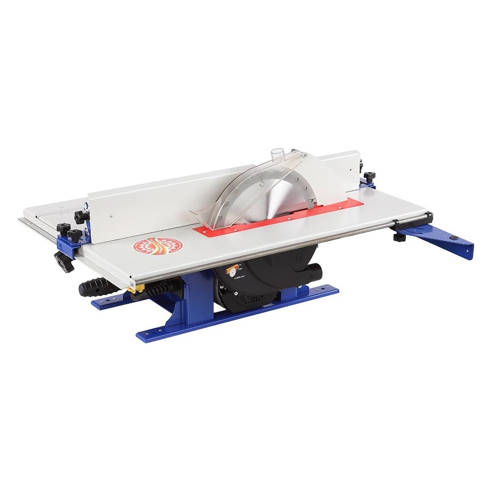 Деревообрабатывающий многофункциональный станок Белмаш MOGILEV 2.0 S127A предназначен для обработки деревянных деталей (фанерные листы, древесно-стружечные плиты) пилением и фугованием с ручной подачей. Конструкция имеет два независимых вала (пильный и ножевой). Для изменения операции достаточно переустановить ремень с одного вала на другой. Натяжение ремня осуществляется автоматически под действием веса электродвигателя и тяговой пружины. Направляющая линейка и приспособление для поперечной распиловки под углом предусмотрены для ориентации заготовки относительно режущего инструмента. Шкала глубины строгания находится на загрузочном столе, который может опускаться с помощью вращающейся ручки. При обработке изделий большой длины необходимо пользоваться подставками или работать вдвоем. Минимальная высота заготовки при строгании и пилении составляет 10 мм. Для коротких (менее 300 мм) и узких деталей необходимо использовать толкатель (входит в комплект). Пиление древесины средней твердости и толщиной до 97 мм производят со скоростью не более 1.5 м/мин. Подача элементов в зону резания должна быть равномерной (без рывков). Масса обрабатываемой детали не должна превышать 40 кг. Расклинивающий нож с защитным кожухом необходим для предотвращения заклинивания пильного диска во время реза. Питание станка осуществляется от однофазной сети переменного тока с заземляющим проводом. Выключатель оснащен защитой от непроизвольного запуска. Для сбора пыли и отходов резания модель имеет два патрубка: Ø28 мм на защитном пластиковом экране и Ø38 мм на кожухе пильного диска. Рекомендуется подключать внешние вытяжные устройства с производительностью не менее 900 м3/ч для быстрого выброса стружки и предотвращения забивания аспирационного отверстия. Компактные размеры и небольшой вес обеспечивают удобное хранение и легкую транспортировку устройства по рабочей площадке.