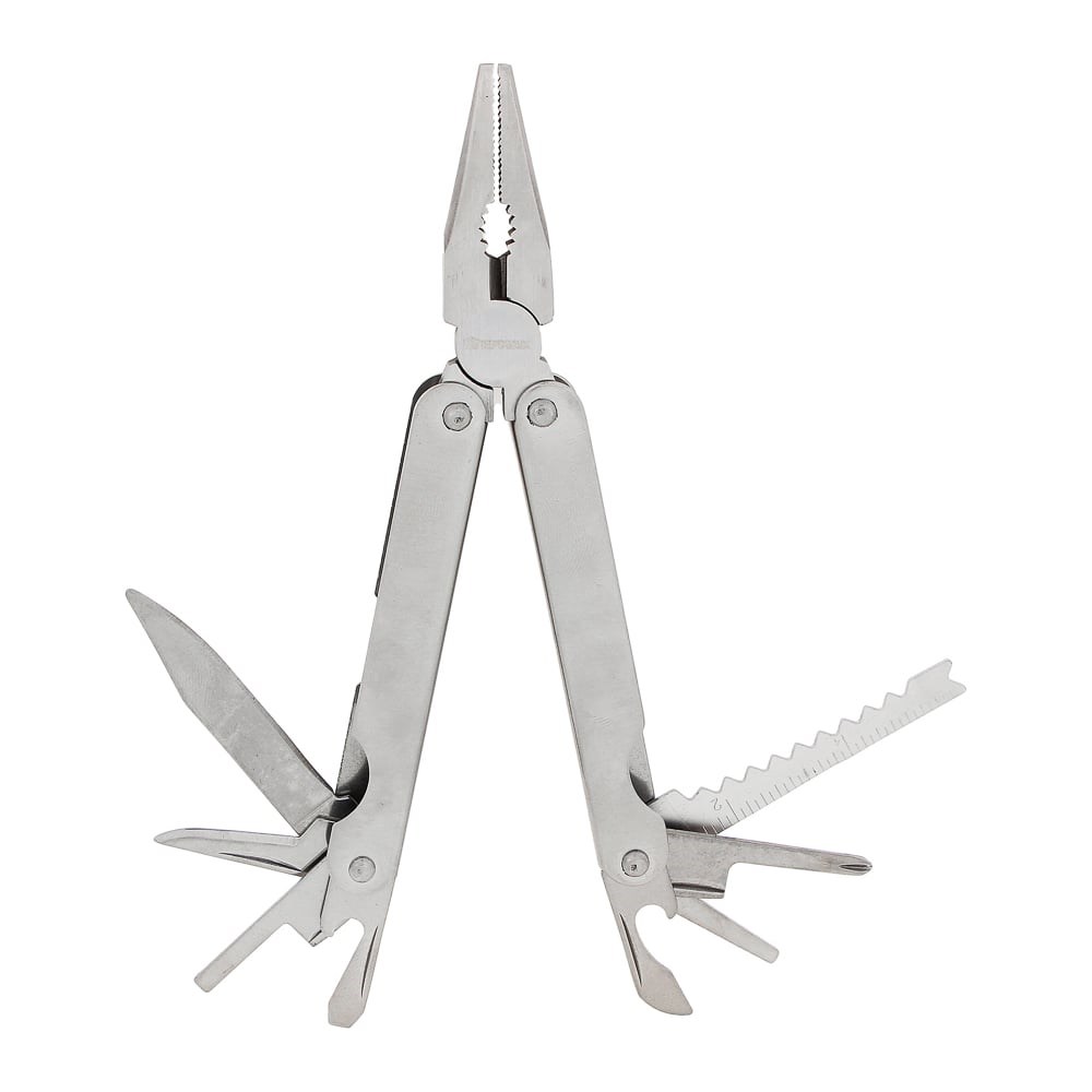 ФункцииПассатижи, кусачки, большой нож, малый нож, отвёртка малая, отвёртка большая, открывалка для бутылок, консервный нож, шило, крестовая отвёртка, линейка, напильник, съёмник крючка, нож для чистки рыбы, длинные щипцы.