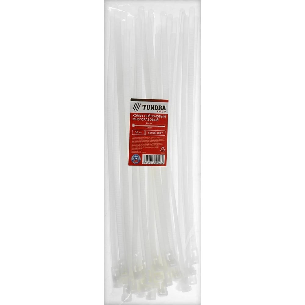 Нейлоновый хомут ТУНДРА многоразовый 7.2х200 мм, белый, в упаковке 50 шт. 1550226